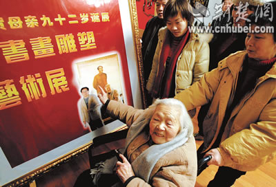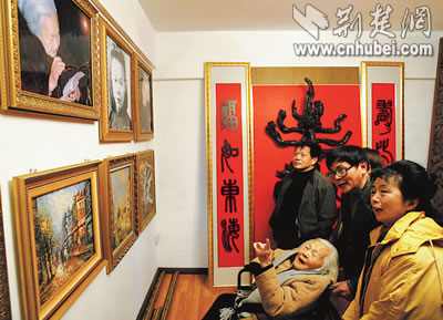 “這是特意為您準(zhǔn)備的生日禮物!”年過六旬的盧永瀚攙扶著92歲的母親,在根雕、油畫面前仔細(xì)講解。“這個(gè)根雕是壽字!”孫女插話說:“就是祝您長壽,活過100歲!”慧老太太邊看邊比劃著,樂得合不攏嘴,用濃重的江浙口音說:“好、好!”