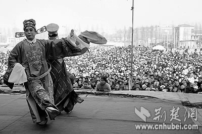 22日下午,潛江市澤口開發(fā)區(qū)彭魯村村民正在欣賞潛江花鼓戲。春節(jié)以來,該市地方歌舞、龍燈、舞獅、采蓮船等群眾喜聞樂見的文藝活動(dòng)遍布城鄉(xiāng),群眾的節(jié)日文化生活異彩紛呈。荊楚網(wǎng)湖北日?qǐng)?bào)記者鄭元昌 通訊員吳燕軍攝