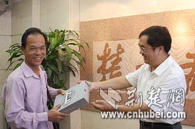 來自赤壁的幸運(yùn)讀者接受江總編輯頒發(fā)的獎品,這位龍先生非常高興,他說他的手機(jī)正好該換了,沒想到運(yùn)氣這么好得到一部這么好的手機(jī)。