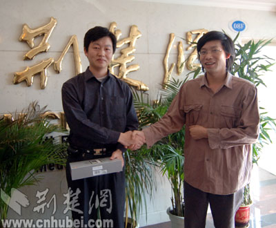 荊楚網(wǎng)24日訊 記者艾丹 潘頔 報道:23日抽出的“讀報紙、發(fā)短信、中手機”活動的兩位幸運獲獎者,武漢的李先生和谷城的孟先生,今天下午來到荊楚網(wǎng)領獎,荊楚網(wǎng)總編輯閻思甜親自為他們頒獎。
