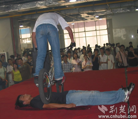 武漢市首屆時(shí)尚體育博覽會(huì)開幕式現(xiàn)場(chǎng)來自硚口區(qū)漢水橋街威風(fēng)鑼鼓隊(duì)在開幕式上進(jìn)行精彩的表演賽車俱樂部的車手和車模亮相東方神馬騎士俱樂部漂亮神氣的女騎士健身教練在進(jìn)行健身表演極限單車高手有驚無險(xiǎn)的表演