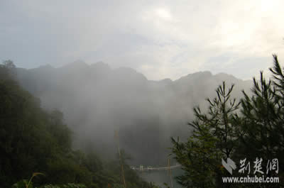 雨后初霽,可惜記者抵達(dá)這里時(shí),趕上主峰的五指上大霧籠罩,所以五指峰的輪廓不是很清晰,大家只能拍攝到云霧中的五指峰。