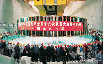 今年8月1日,三峽左岸電廠的最后一臺發(fā)電機組轉(zhuǎn)子吊入機坑(圖二)。令三峽建設(shè)者們感到自豪的是,這同樣是世界上最大的發(fā)電機組,不同的是其零部件國產(chǎn)化程度達到85%。