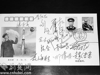 我國首批宇航員在傘訓(xùn)結(jié)束后留給傘訓(xùn)教官李振波的首日封,上面有楊利偉、聶海勝、費俊龍、翟志剛、李慶龍、潘占春、劉旺、劉伯明、吳杰、張曉光、景海鵬、趙傳東、陳全、鄧清明14名宇航員的親筆簽名。湖北日報記者徐和平特約記者趙啟洪攝