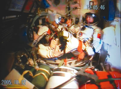 17時29分,航天員向地面飛控中心報告飛船工作正常,已做好開啟返回艙艙門的準備。在得到地面指揮員的指令后,費俊龍打開返回艙艙門,在聶海勝的幫助下進入軌道艙工作。