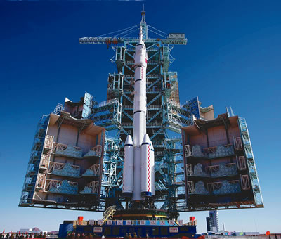 長征二號F型火箭等待著它的第6次飛行。兩小時45分鐘前,執(zhí)行神舟六號載人航天飛行任務(wù)的航天員費俊龍和聶海勝進入飛船返回艙,“神箭”和“神舟”第一次迎來了兩名乘客。