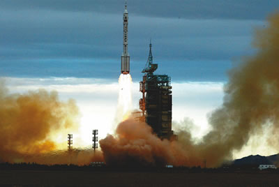 9時整,費俊龍、聶海勝乘坐神舟六號飛船在長征火箭的托舉下,飛向太空。