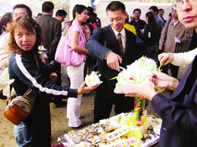 這個(gè)匠心獨(dú)運(yùn)的蛋糕由妞妞公司制作贈送。其主體部分是一條飛龍,并書有“飛龍?jiān)谔臁弊謽。飛龍一側(cè),則是一只“神舟六號”航天飛船模型。