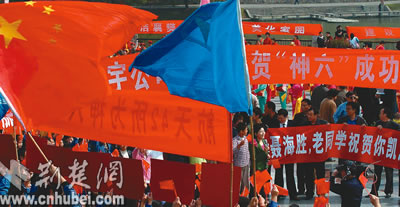 (cnhubei.com) Relatives and townsfolks of Nie Haisheng, one of the Shenzhou VI astronauts celebrated the safe return of him in his hometown Zaoyang of central China’s Hubei Province on October 17, 2005
