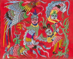 苗繡 刺繡,是苗族婦女盛裝不可或缺的飾物,主要有領(lǐng)花、肩花、襟花、背塊花、袖口花、裙鑲花、帽頂花、帽頂花等品種。苗族刺繡,整體上多為幾何構(gòu)圖,古樸多姿。其圖案因繡片條、塊的不同,分為幾何二方連續(xù)式和四方連續(xù)式構(gòu)圖。其圖案取材于生活中常見的草木、鳥獸、蟲魚、器具等。圖案的整體布局一般以菱形為立體紋樣,常見的是大菱形中套小菱形,小菱形又分別由不同色彩的方、圓、三角點狀組成。條狀繡片,多用點、線或線面組合,一整二剖構(gòu)圖。繡片是按布的經(jīng)緯戳針,故曲線多折角。大塊繡片,如背塊花等,多用菱形四方連續(xù)構(gòu)圖,并在其中布以對稱的變形幾何點及其他折線。所有繡片,粗看五彩斑斕,細觀則不同色線組圖分明,交錯重疊,既復雜多變又結(jié)構(gòu)嚴謹、條理清晰。繡法很多,有平繡、凸繡、辮繡、堆花、縐繡、纏繡、挑繡、抽花等。平繡是最曾遍的繡法。這種繡法是重于圖案布局的美觀勻稱,色調(diào)鮮明,有明顯的物象感。凸繡流行于凱里、臺江部分地區(qū),它是在底布上多鋪幾層紙花,使所繡圖案凸出,有立體感。辮繡只在雷公山巴拉河一帶流行,其方法是將若干根色線編成辮子,按設(shè)計圖案平鋪于底布上,用絲線釘牢即成。圖案色調(diào)大致是青年女子鮮艷,中年以上婦女稍渾暗。如凱里、黃平、施秉等地,姑娘及較年輕婦女的盛裝刺繡以青布作底,繡大紅,間有少量白黃綠之色,亮麗醒目;中年以上婦女盛裝刺繡,亦以青布作底,以紫藍為基調(diào),間以少許桔紅、綠、白等色,顯得深沉穩(wěn)重。 京繡 京繡又稱宮繡,明清時期開始大為興盛,多用于宮廷裝飾、服飾,用料講究、技術(shù)精湛、格調(diào)風雅,民間高檔的宮繡大都與皇宮有著千絲萬縷的聯(lián)系。京繡屬手工刺繡,所以在今天機繡發(fā)達的時候,為區(qū)別于機繡又名“手繡”。京繡在解放后,逐漸形成了自己鮮明的藝術(shù)特點與風格,其選料精當貴重,針工巧妙得體,色彩絢麗豪華,格調(diào)高雅。其中最好為針工中的“平金打籽”繡。這種繡,是以真金捻線盤成圖案,或結(jié)籽于其上,十分精致,華貴。 發(fā)繡 發(fā)繡,又稱“墨繡”。是以人的頭發(fā)為材料,在綢緞、絲絹或滌綸布上精心繡制的特種藝術(shù)品。具有淡雅、不褪色、耐腐蝕、利于收藏等特點。彩色發(fā)繡是相對于單色發(fā)繡而言,它是指以不同人種的天然色澤發(fā)絲為材料,遵循色彩規(guī)律,在繃平整的布帛上施針度線,塑造形象的藝術(shù)。作品的質(zhì)感效果特別好, 畫面有微妙的色彩變化,層次較單色發(fā)繡豐富,技巧靈活多變,形象更加栩栩如生。 材料的特質(zhì)屬性賦予發(fā)繡藝術(shù)獨特的魅力,具有豐富的人文內(nèi)涵,如用自己的頭發(fā)繡一幅寫真“二我”,具有生命的直接紀念意義。作品集繪畫與刺繡為一體,具有一定的美學價值和經(jīng)濟價值,又能經(jīng)久保存,千年不變,可謂收藏極品。 甌繡 由于溫州地處甌江之濱,故得名“甌繡”。400多年以前,浙江溫州地區(qū)已運用刺繡美化服飾, 繡品技藝也達到相當水平。據(jù)說甌繡最早產(chǎn)生于民間婦女之手,那時的刺繡品種有衣服、小兒帽 圈、圍涎、錦肚、婦女鞋面、枕頭、荷包等。題材只有花鳥魚蟲之類。甌繡真正成為供欣賞的藝 術(shù)品只有60多年歷史。1922年前后,溫州刺繡藝人林森友在上海一家刺繡莊發(fā)現(xiàn)了湘繡畫片, 回來后開辦了“美艷”刺繡作坊,仿照湘繡畫片的技法,改進甌繡生產(chǎn)。從此,溫州出現(xiàn)了甌繡畫片。