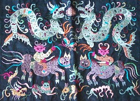 魯繡 魯繡——山東地區(qū)的代表性刺繡,是歷史文獻中記載最早的一個繡種,屬中國“八大名繡”之一。 “齊紈”、“魯縞”早在春秋戰(zhàn)國時期已是全國聞名的產(chǎn)品。當時齊國有“冠帶衣履天下”的盛譽。據(jù)《論衡》記載:“齊郡刺繡,恒女無不能者,目是而手狎也”。 從唐代后期,我國北方連年戰(zhàn)亂,桑地及織繡生產(chǎn)受到嚴重破壞,若干織繡工人遷徙南方,北方刺繡長期衰落。直至明代后期,魯繡又聞名于世,達到高度水平。 現(xiàn)在臨淄考古組存有東周時期的刺繡殘片,鄒縣文物保管所存有元代的魯繡珍品,故宮博物院存有較多的明代魯繡,如《百鳥朝鳳圖》、 《羅漢圖》,其構(gòu)圖嚴謹,手法多樣,花紋粗獷雄健,質(zhì)地堅實,色彩對比強烈,形象生動,是魯繡杰出的代表作。 魯繡主要特點是:構(gòu)圖簡練樸實、色彩明亮對比強烈,針法粗細相間,極富裝飾性和立體感,既華麗而又素雅。其代表產(chǎn)品主要有花鳥、書法、人物。 魯繡憑其工藝精湛、構(gòu)圖和色彩迷人受到了全世界人們的寵愛。早在兩千年前的漢朝,魯繡就通過絲綢之路傳到西亞,轉(zhuǎn)而傳向歐洲的羅馬帝國。目前,刺繡已出口到一百多個國家和地區(qū),成為中國刺繡文化與和平藝術(shù)的使者。 汴繡 汴繡,也稱宋繡,距今已有八百余年歷史,是我國名繡之一,素有"國寶"之稱。它以繡工精致,針法細密,圖案嚴謹,格調(diào)高雅,色彩、秀麗而著稱,早在宋代就已馳名全國。據(jù)記載:北宋時期已有"文繡院"。當時皇帝的龍袍、官員的朝服、烏紗帽、朝靴都為刺繡精品。據(jù)《東京夢華錄》載,民間刺繡也極為興盛,到處"繡簾相拓"、"錦繡交輝"。宋代刺繡工藝已發(fā)展到相當水平,據(jù)明代屠龍《畫箋》所載,"宋之閨繡畫……女紅之巧,十指春風,迥不可及'。北宋滅亡,汴繡遭動一蹶不振。 為了繼承宋代閨繡這一傳統(tǒng)工藝,開封汴繡廠于一九五四年成立。建廠后,新老藝人在繼承傳統(tǒng)工藝的基礎(chǔ)上,錄蹤探微,博采眾家之長,反復試驗,在傳統(tǒng)的以平針為主的技藝之上,又創(chuàng)新了散針、亂針、滾針、水紋蒙針等幾十種針法。多種針法的交替使用,不僅能把陰陽遠近一一表現(xiàn)出來,而且表現(xiàn)內(nèi)容豐富,富有立體感。汴繡針法既長于刺繡花鳥蟲魚飛禽走獸,又善于創(chuàng)作氣勢磅礴的山水圖景,刻畫人物形象更是細致傳神。繡品既具有蘇雅潔活潑的風格,又具有粵繡明快豪放的特點。1959年汴繡《清明上河圖》繡成,作為國慶十周年獻禮,陳列在人民大會堂,它以針代筆,以線代暈,使這幅宏偉浩繁的歷史風俗畫卷逼真地展現(xiàn)在人們眼前。作品展覽時,中外客人無不嘆服。 改革開放以來,汴繡工藝又得到進一步的發(fā)展與創(chuàng)新,精品選出,如《清明上河圖》、《百駿圖》、《五牛圖》、《韓熙載夜宴圖》、《簪花仕女圖》等繡品均為國家收藏或被國外友人重金購去。此外,汴繡除刺繡之外,還有單面繡、雙面繡、三異繡及大量機繡產(chǎn)品,品種繁多,題材廣泛。 漢繡 漢繡主要流行于荊沙、武漢、洪湖一帶。漢繡作品曾多次在京展出,還參加了巴黎、華沙等國際展覽,受到好評。 漢繡,以楚繡為基礎(chǔ),融匯南北諸家繡法之長,揉合出了富有鮮明地方特色的新繡法。它的用針有別于四大名繡……蘇繡、蜀繡、湘繡和廣繡,采用一套鋪、平、織、間、壓、纜、摻、盤、套、墊、扣的針法,以“平金夾繡”為主要表現(xiàn)形式,分層破色、層次分明,對比強烈。追求充實豐滿、富麗堂皇的熱鬧氣氛,繡品可以枝上生花,花上生葉,葉上還可出枝,充分體現(xiàn)了“花無正果,熱鬧為先”的美學思想,呈現(xiàn)出渾厚、富麗的色彩。 從春秋中期到戰(zhàn)國時,楚國的刺繡品已遠銷到西伯利亞地區(qū),可見其刺繡業(yè)之發(fā)達。南方的楚國絲織業(yè)足以代表當時我國絲織品工藝技術(shù)的最高水平。屈原的《楚辭·招魂》為我們描繪了一幅楚宮絲織品圖畫,“翡翠珠被,爛齊光些。蒻阿拂壁,羅帳張些;纂組綺縞,結(jié)琦璜些!鋷鋷,飾高堂些”,“被文服纖,麗而不奇些!边@種需求對刺繡品的生產(chǎn)、發(fā)展的刺激是不難想見的。同時,楚文化氛圍下民間戲曲的發(fā)達、巫風巫月術(shù)的盛行又為刺繡走向民間提供了生長的沃土。 漢繡的鼎盛期是清末民初。咸豐年間,漢口設(shè)有織繡局,集中各地繡工繡制官服和各種飾品。清末,在武昌的營坊口、塘角、白沙州、積玉橋和漢口的黃陂街、大夾街一帶,開有許多繡鋪,漢口還有一條繡花街。當時的漢繡產(chǎn)品主要分三類:作為生活用品的有繡衣、繡枕、門簾、帳沿、繡鞋、頭巾、圍裙、荷包等,多用于閨閣陪嫁。其中,漢口的繡花戲衣頗具名氣。二是裝飾品。有壁掛、中堂、屏風、彩帳、堂彩、龍衣、獅皮、戲裝、道具等。三是敬神賽會的禮儀用品,包括神袍、袈裟、彩幡等。 抗戰(zhàn)時期,日軍侵占武漢,漢口繡花街被燒毀,漢繡日趨凋零,技藝幾近失傳。新中國建立以后,漢繡才重放光華。80年代,漢繡產(chǎn)品已由原來的民用小繡品和少量古典戲劇繡服發(fā)展到帳簾、披風、被面、枕套、服裝、大幅、中堂、條屏、折頁、搖件和屏風等十多個品種。 江陵馬山一號墓發(fā)掘出的戰(zhàn)國中期繡品,進一步證實了漢繡的歷史承載量。繡線顏色以紅、黃、綠、蘭