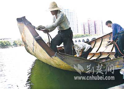 “船太大了,沒辦法運出城,只好進行分解后運走。”負責(zé)現(xiàn)場施工的馬先生解釋,2002年初,他所在的公司承攬東湖清淤工程,共運來8條清淤船,其中一條船放置在水果湖。當(dāng)時,經(jīng)有關(guān)部門批準(zhǔn),這些船由大型車輛運來并吊入湖中。目前清淤工程結(jié)束,湖中的船不好運走,只好割成一塊塊鋼板,當(dāng)成廢鋼賣掉。