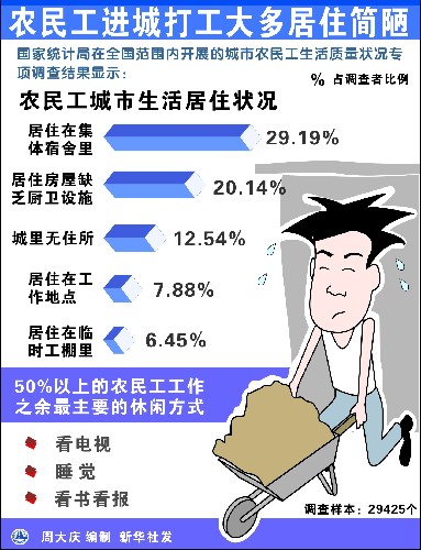 農(nóng)民工在城市打工,大多居住在簡陋的宿舍里。據(jù)調(diào)查,有29.19%的農(nóng)民工居住在集體宿舍里,有20.14%的農(nóng)民工居住在缺乏廚衛(wèi)設(shè)施的房間里,有7.88%的農(nóng)民工居住在工作地點(diǎn),有6.45%的農(nóng)民居住在臨時(shí)搭建的工棚里,還有12.54%的農(nóng)民工在城里沒有住所,只能往返于城郊之間,或回農(nóng)村居住。