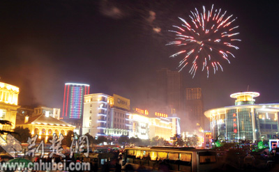荊楚網(wǎng)消息(楚天金報(bào))記者胡彩麗、畢衛(wèi)報(bào)道:“火樹銀花不夜天,爆竹聲聲慶新春!弊蛱,金豬年春節(jié)的元宵節(jié),一輪鵝黃的圓月映照三鎮(zhèn),八百萬(wàn)江城人的歡樂和激情,化作了漫天絢爛的禮花和連綿不絕的鞭炮聲。