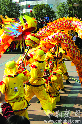 巨龍吶喊,昂首向前跑;鞭炮助威,鼓點(diǎn)聲聲急;禮花漫天,寄托著人們美好的心愿——明天更燦爛。