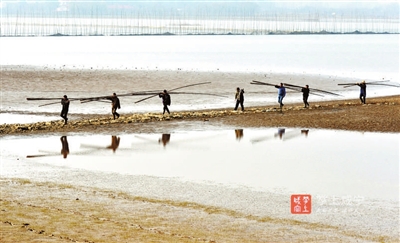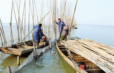 一旁,駕駛著機(jī)船的漁民們,或忙著收網(wǎng),或配合將割下的竹子運(yùn)回岸邊。船只在湖面上留下道道漣漪,灘涂上抗著竹子的漁民蜿蜒成一幅畫(huà)。