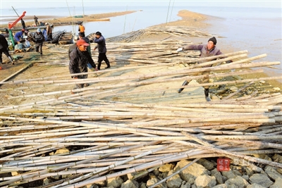 一根根圍桿被運(yùn)上岸。