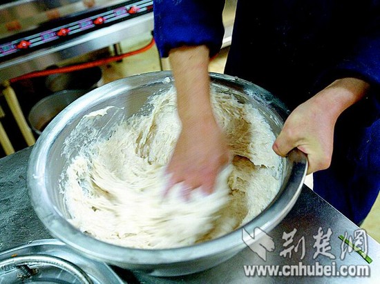 圖為:新鮮的魚(yú)肉剁成魚(yú)蓉,攪拌上勁。