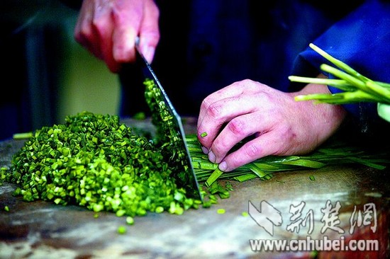 圖為:將新鮮野芹菜、野韭菜切成沫。