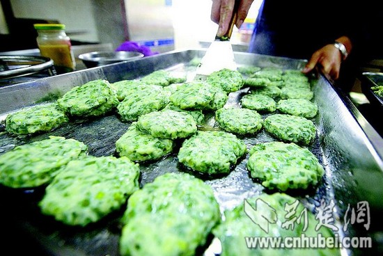 湖北日?qǐng)?bào)訊 早春,野菜餅成為咸寧市百姓一道特色佳肴。制作野菜餅時(shí),先取新鮮魚(yú)肉打成魚(yú)蓉,再將采摘的新鮮野芹菜、野韭菜等切成沫,加入魚(yú)蓉混合攪勻,制成直徑十厘米大小的小餅上蒸鍋蒸,再裹上蛋黃煎至金黃,清香撲鼻。