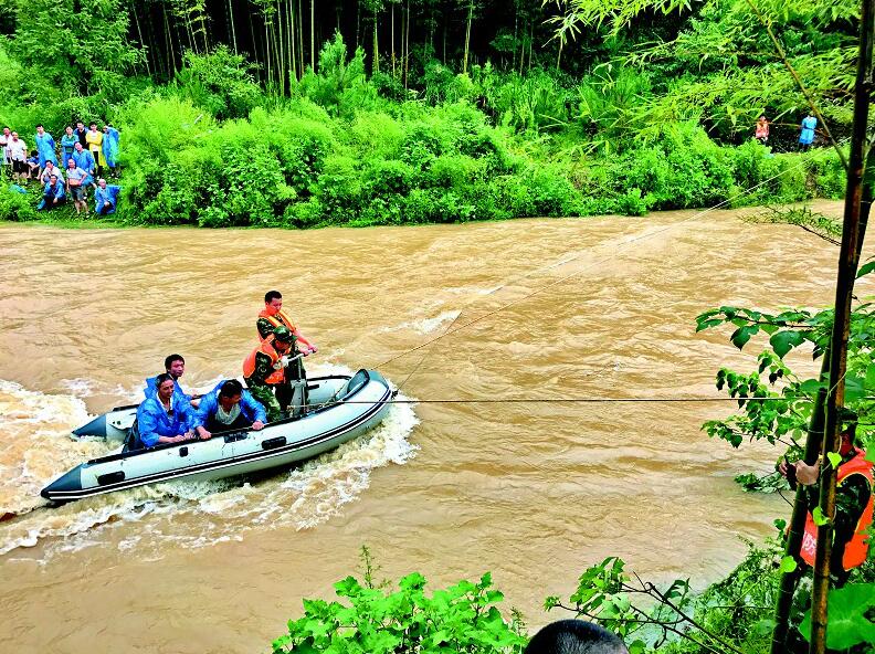 圖為昨日清晨崇陽40人送葬隊(duì)伍突遇山洪被困,消防官兵拋繩擺渡安全轉(zhuǎn)移。