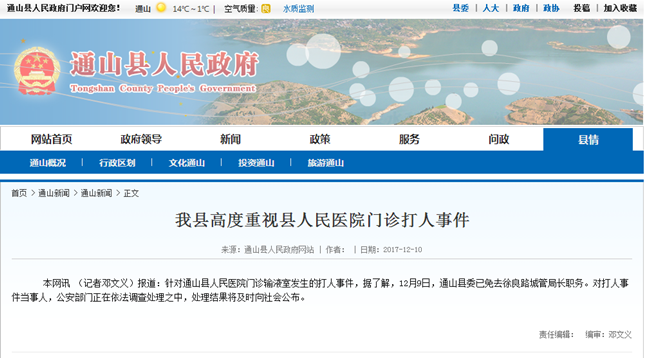 據(jù)通山縣委宣傳部通報:2017年12月8日中午,通山縣人民醫(yī)院門診輸液室發(fā)生打人事件,通山縣公安局及時出警調(diào)查取證。事件發(fā)生后,通山縣委、縣政府高度重視,組建專班進行處置,召集縣政府應(yīng)急辦、公安局、衛(wèi)計局、縣人民醫(yī)院等部門負責(zé)人會議:由縣人民醫(yī)院院長成忠了負責(zé)組建醫(yī)療專班,做好治療護理工作;由縣人民政府副縣長金大德負責(zé)組建公安調(diào)查專班,確保處置及時快速、公平公正。該事件正在調(diào)查處置中,處置結(jié)果將及時向社會公布。