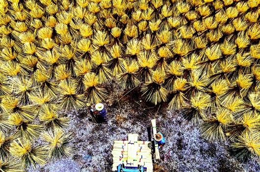 6月25日,咸寧市咸安區(qū)汀泗橋鎮(zhèn)赤崗村鑫源竹加工廠,工人們正在翻曬一捆捆長(zhǎng)長(zhǎng)的竹筷子,宛如一朵朵花開(kāi)在曬場(chǎng)上。咸安區(qū)竹資源豐富,當(dāng)?shù)亟ǔ煽稍偕闹裱h(huán)產(chǎn)業(yè),有上下游竹加工廠20多個(gè),滿山翠竹成為當(dāng)?shù)剞r(nóng)民的“致富竹”。