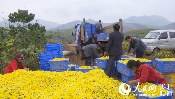 人民網通山11月15日電 深秋十一月,是秋菊的最佳采摘季節(jié)。近日,湖北通山縣燕廈鄉(xiāng)湖畔村和尚頭貢菊種植基地,那金黃色的花兒,忍不住秋天的誘惑競相開放。放眼望去,幾十位村民正在緊張忙碌采摘金黃的貢菊,田里一片繁忙的景象。