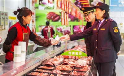12月27日,武邑縣食品和市場監(jiān)督管理局執(zhí)法人員在一家超市檢查肉類銷售人員的健康證。