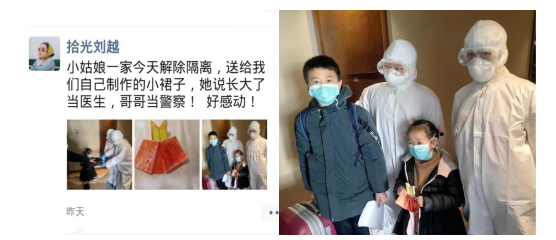 隔離解除,依依惜別,萌娃兄妹把精心制作的手工,送給日夜相伴的“拾光劉越”等醫(yī)護人員?!伴L大也要當醫(yī)生、當警察。”稚氣的話語,讓“拾光”感動。