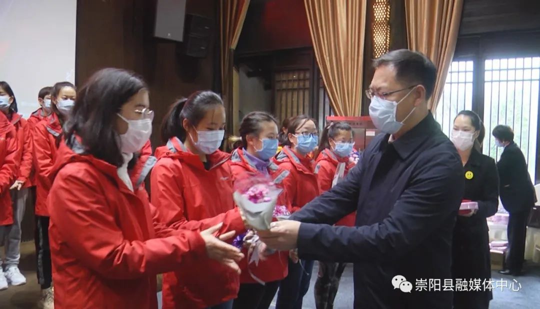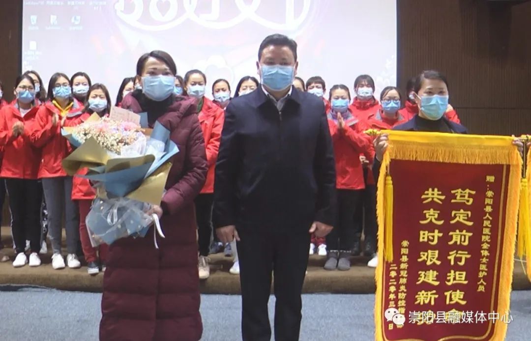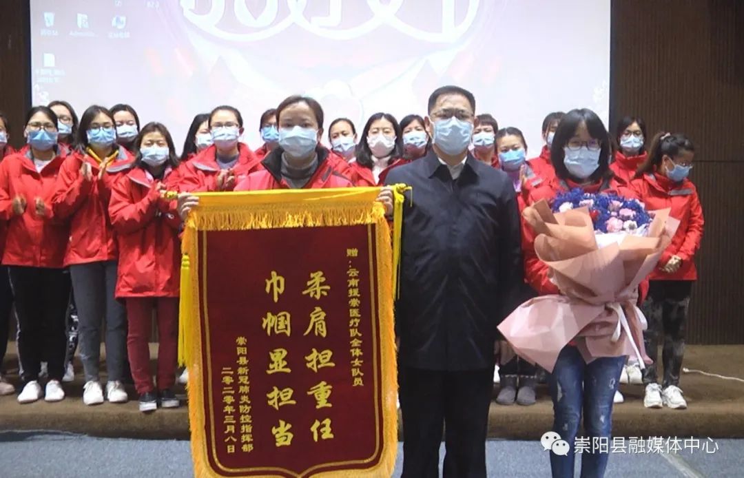 活動中,縣委副書記、縣長鄭俊華向云南援崇醫(yī)療隊贈授“柔肩擔重任·巾幗顯擔當”感謝錦旗,縣委副書記、縣委政法委書記程冰野為崇陽縣人民醫(yī)院授予“巾幗建功集體”榮譽錦旗,同時,向每一位云南援崇醫(yī)療隊女醫(yī)護人員和奮戰(zhàn)在戰(zhàn)“疫”最前線的女醫(yī)生、女護士代表送上了鮮花和節(jié)日禮物。