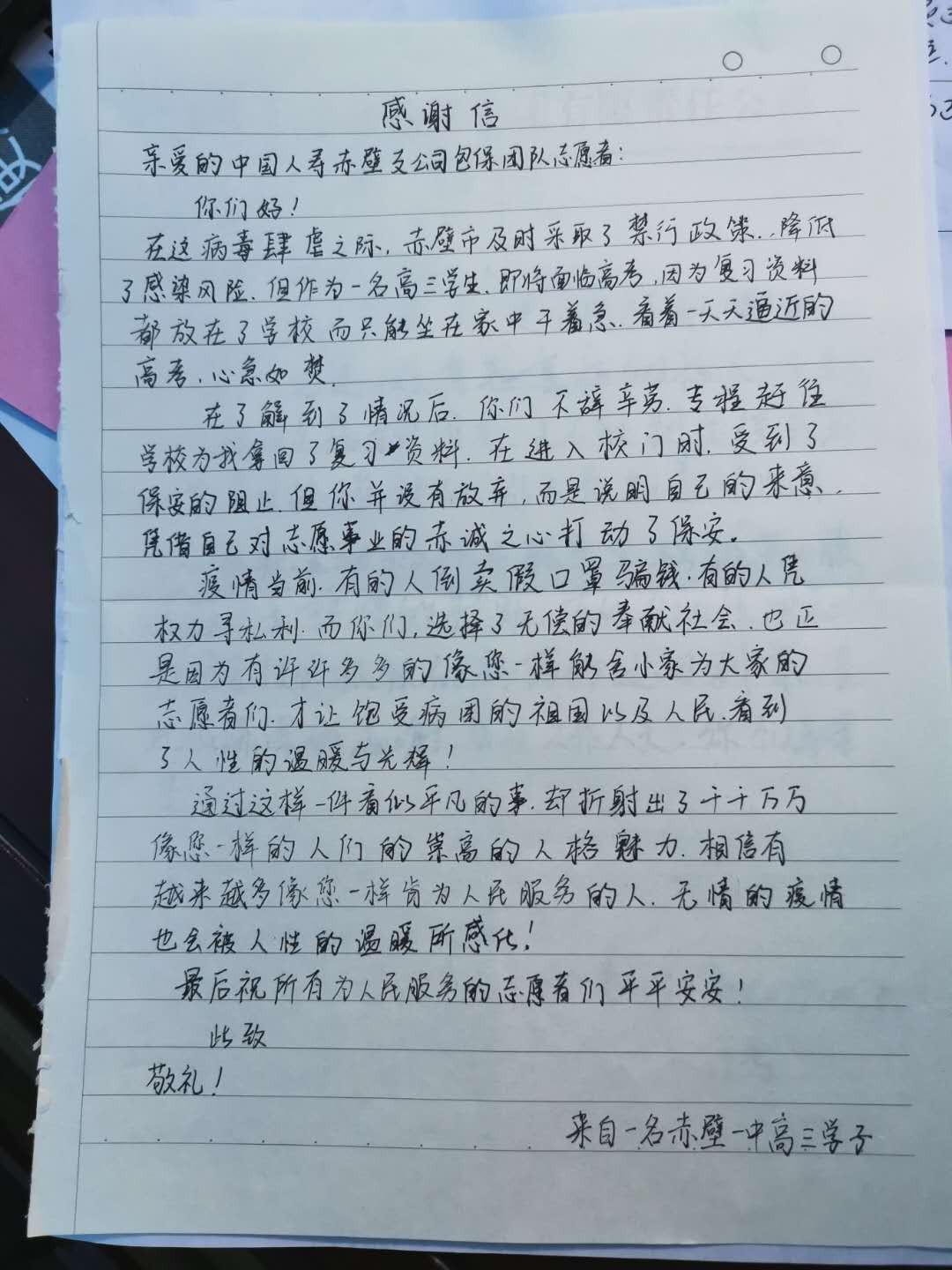 “作為一名即將面臨高考的高三學(xué)生,因?yàn)閺?fù)習(xí)資料都放在了學(xué)校而只能坐在家中干著急。看著一天天逼近的高考,心急如焚!謝謝你們不辭辛勞,專(zhuān)程趕往學(xué)校為我拿回了復(fù)習(xí)資料……”這是一名高三學(xué)生寫(xiě)給小區(qū)包保單位中國(guó)人壽赤壁支公司的一封感謝信。這樣的感謝信該公司還收到很多,有感謝聯(lián)系車(chē)輛為患者買(mǎi)藥的,有感謝為他們購(gòu)買(mǎi)奶粉等生活物資的……