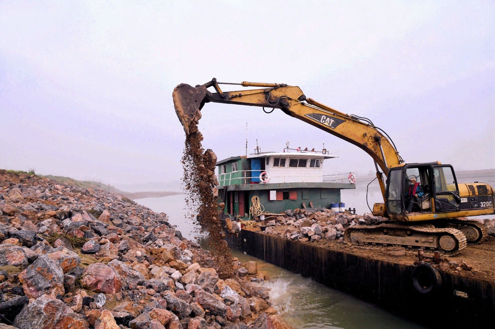 陸水河四清垸大堤全長450米,多年來的洪水侵襲致使河床下沉,堤岸崩裂。對此,赤壁市制訂了堤岸拋石護(hù)腳整治規(guī)劃。隨著疫情逐漸好轉(zhuǎn),赤壁市于3月18日啟動(dòng)工程維修計(jì)劃,投入大量人力物力。隨著挖掘機(jī)鐵臂的揮舞,一塊塊巨石墜落在河岸,為大堤的防洪能力再加一道保險(xiǎn)。