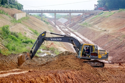 5月22日,在斧頭湖流域兩湖連通工程施工現(xiàn)場(chǎng),工程翻斗車、推土機(jī)、壓路機(jī)往來穿梭,對(duì)下穿G351國道箱涵周邊進(jìn)行土石分層填筑、分層碾壓。