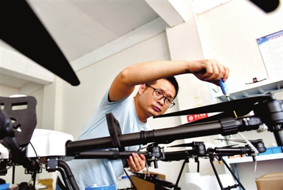 8月10日,咸安鳳凰工業(yè)園天意模型科技公司總經(jīng)理陳克朋正在組裝農(nóng)業(yè)植保無人機。