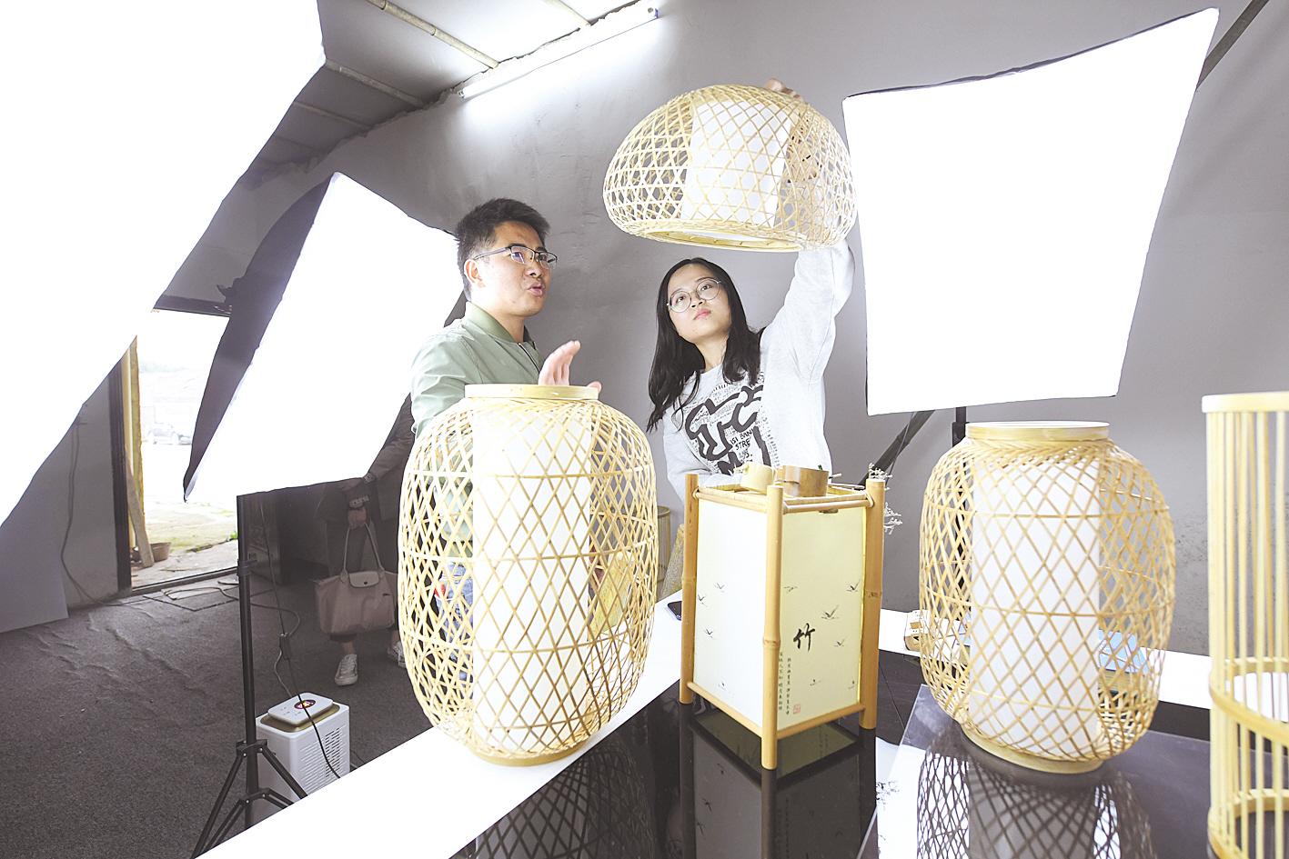 10月14日,咸寧市咸安區(qū)大幕鄉(xiāng)雙垅村竹雕藝人在攝影棚向客人介紹竹制家居用品和工藝品。去年5月,當(dāng)?shù)卮髮W(xué)畢業(yè)生賀慈回鄉(xiāng)創(chuàng)業(yè),成立藝竹情工藝品公司,聘請(qǐng)民間藝人手工制作工藝品,通過電商銷售,今年前三季度銷售額500多萬(wàn)元。