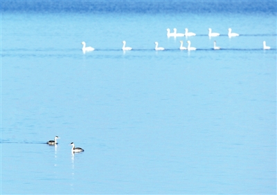 西涼湖管理局相關(guān)負(fù)責(zé)人介紹,西涼湖水域面積12.78萬畝,湖岸線377公里,湖汊多、灘涂淺,各種水生植物和魚蝦繁多,非常適宜天鵝對(duì)水質(zhì)、覓食的要求。為保護(hù)濕地生態(tài)環(huán)境,他們每天安排專人進(jìn)行岸線和湖面執(zhí)法艇巡查,確保候鳥安全越冬。