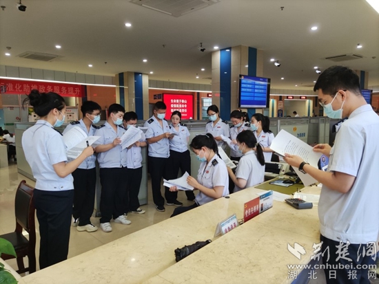 圖為稅務(wù)窗口人員利用午休時間開展“楚稅通”APP專項(xiàng)業(yè)務(wù)培訓(xùn)。(通訊員 供圖)