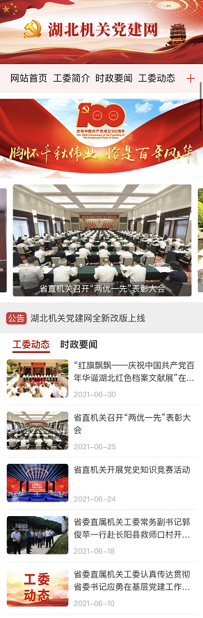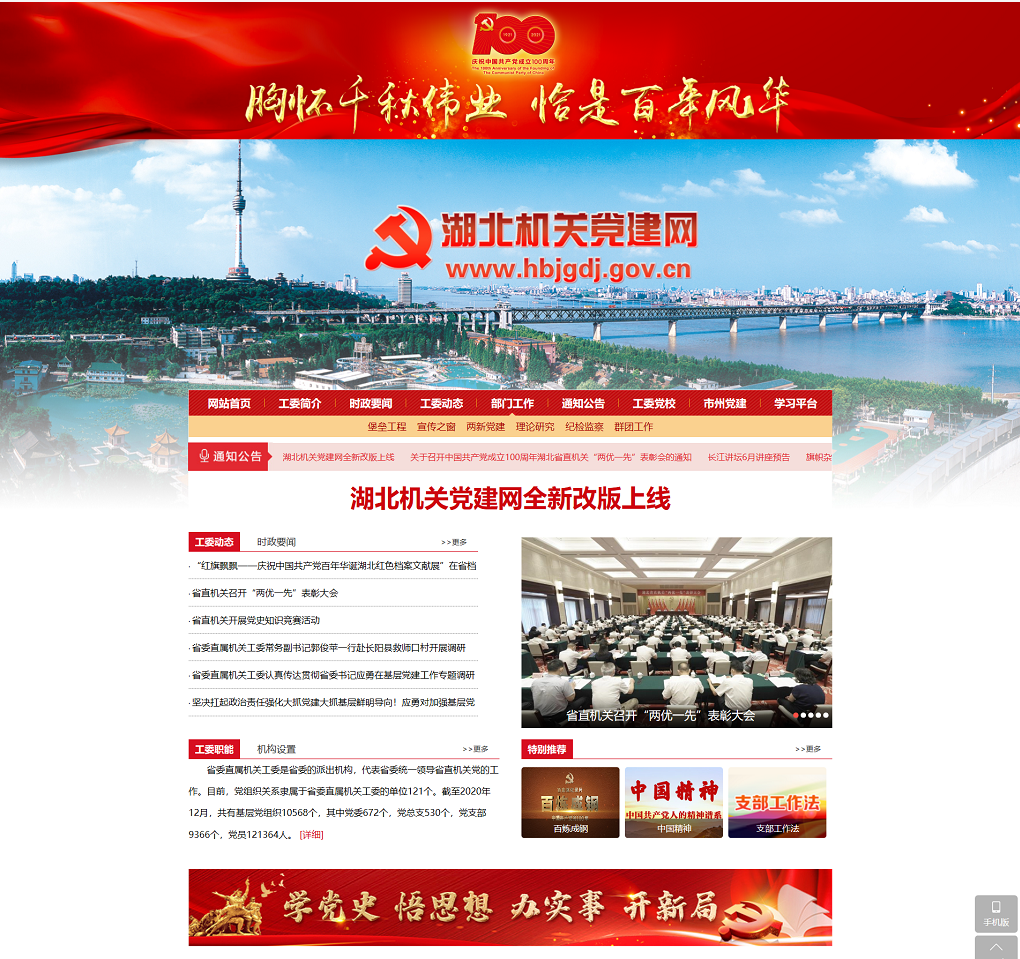 荊楚網(湖北日報網)訊(記者謝頤 通訊員鄭羽嬋)在中國共產黨成立100周年之際,湖北機關黨建門戶網站湖北機關黨建網(http://www.hbjgdj.gov.cn/)電腦端、移動端全新改版上線。這是省委直屬機關工委積極探索智慧黨建的有效途徑,是加強省直機關黨建宣傳工作的重要舉措,是為黨慶生、為黨祝福獻上的特殊禮物。