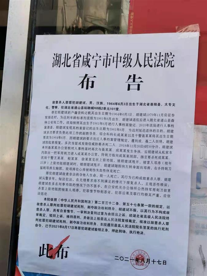 布告顯示,罪犯胡建斌因犯故意殺人罪,已于布告發(fā)布當(dāng)天,對其執(zhí)行死刑。9月5日,楚天都市報極目新聞記者來到當(dāng)事人鄧濤家中探望,在其親屬的講述和還原下,這位有血有肉的英雄仿佛再次回到人們眼前。