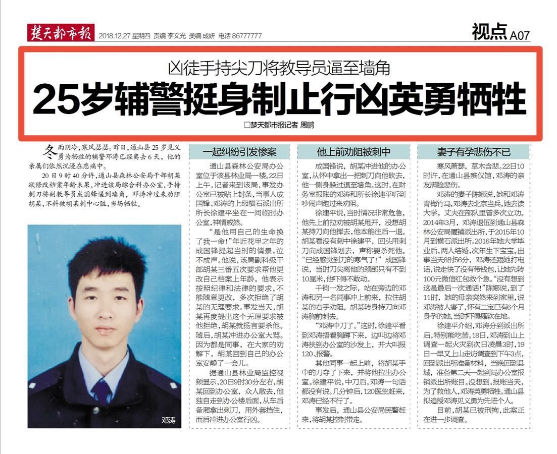 2018年12月27日,楚天都市報一篇《兇徒手持尖刀將教導(dǎo)員逼至墻角 25歲輔警挺身制止行兇英勇犧牲》的報道對這一案件進(jìn)行了詳細(xì)披露,一時間也在互聯(lián)網(wǎng)上引發(fā)強烈反響。之所以引起廣泛關(guān)注,只因文中那個手持尖刀的兇手,不是一個普通歹徒,而是一名人民警察。