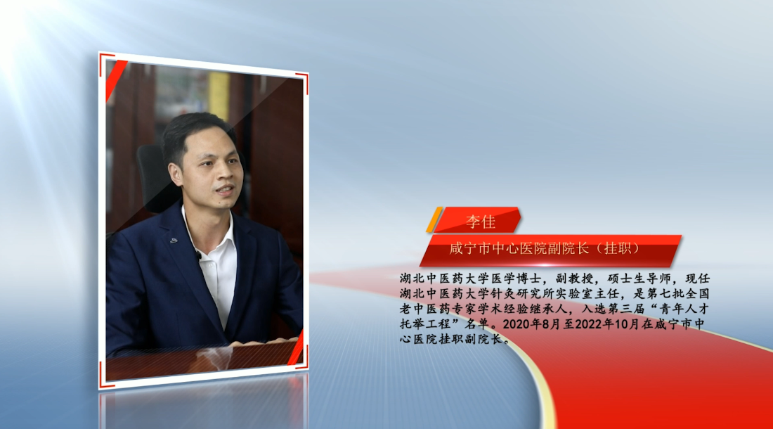【人物名片】李佳, 湖北中醫(yī)藥大學(xué)醫(yī)學(xué)博士,副教授,碩士生導(dǎo)師,現(xiàn)任湖北中醫(yī)藥大學(xué)針灸研究所實(shí)驗(yàn)室主任,是第七批全國(guó)老中醫(yī)藥專家學(xué)術(shù)經(jīng)驗(yàn)繼承人,入選第三屆“青年人才托舉工程”名單。2020年8月至2022年10月在咸寧市中心醫(yī)院掛職副院長(zhǎng)。