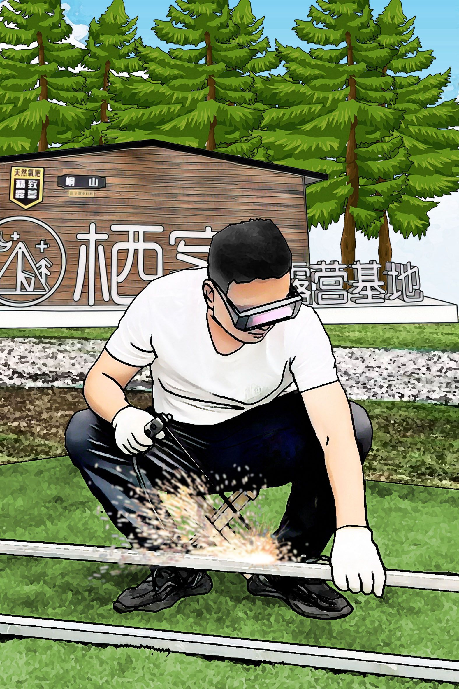 2022年8月,陳川正式與峒山村簽約,投資300萬元,在十里水杉林建設棲客露營基地。在基地建設過程中,陳川既是老板也是員工,設計圖紙,搬運器材,焊接構件……幾乎什么活兒都干。看到這個后生如此上進,熱心的村民們紛紛前往工地幫忙。
