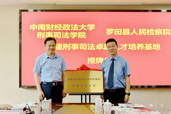 當(dāng)天,中南財(cái)經(jīng)政法大學(xué)刑事司法學(xué)院與羅田縣人民檢察院舉行共建刑事司法卓越人才培養(yǎng)基地簽約揭牌儀式,中南財(cái)經(jīng)政法大學(xué)刑事司法學(xué)院院長(zhǎng)胡向陽(yáng),羅田縣人民檢察院黨組書(shū)記、檢察長(zhǎng)汪輝為檢校共建協(xié)議簽約,為“刑事司法卓越人才培養(yǎng)基地”揭牌。