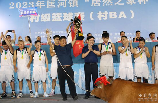 當(dāng)晚7點,隨著哨聲響起,和美鄉(xiāng)村隊與豹龍隊展開激烈角逐。雙方隊伍配合默契,帶球、傳球、上籃一氣呵成,內(nèi)線強(qiáng)打、后仰跳投、三分遠(yuǎn)投精彩不斷,贏得了場內(nèi)外觀眾的陣陣歡呼。隨著終場哨響,比分定格在84:59,和美鄉(xiāng)村隊最終奪得匡河鎮(zhèn)“居然之家杯”村級籃球賽男子組的冠軍,成功牽走“冠軍牛”。