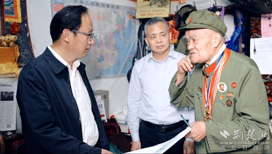 當天上午,黃石市委宣傳部副部長、市委網(wǎng)信辦主任萬金光,黃石市退役軍人事務(wù)局黨組書記、局長陳鵬圖一行參加啟動儀式,并前往抗美援朝老戰(zhàn)士瞿介昌住處看望。他們向瞿介昌老戰(zhàn)士簡單介紹了本次主題報道情況,向這位老英雄獻上了鮮花,表達了對退役軍人的敬意,并為“致敬英雄”采訪團授旗。