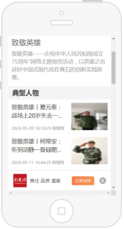 為向歷史開(kāi)掘精神資源,營(yíng)造崇尚英雄、學(xué)習(xí)英雄、關(guān)愛(ài)英雄的濃厚氛圍,黃石市委網(wǎng)信辦、市退役軍人事務(wù)局聯(lián)合荊楚網(wǎng)(湖北日?qǐng)?bào)網(wǎng))啟動(dòng)《致敬英雄》大型網(wǎng)絡(luò)專題宣傳。