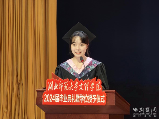 根據(jù)安排,現(xiàn)場分別宣讀了《關(guān)于授予2024屆畢業(yè)生學士學位的決定》和《關(guān)于表彰2024屆優(yōu)秀畢業(yè)生的決定》。隨后,優(yōu)秀畢業(yè)生代表劉佳欣、優(yōu)秀在校生代表聶菁蕓、優(yōu)秀校友代表李震威、教師代表肖燕琴分別發(fā)言。