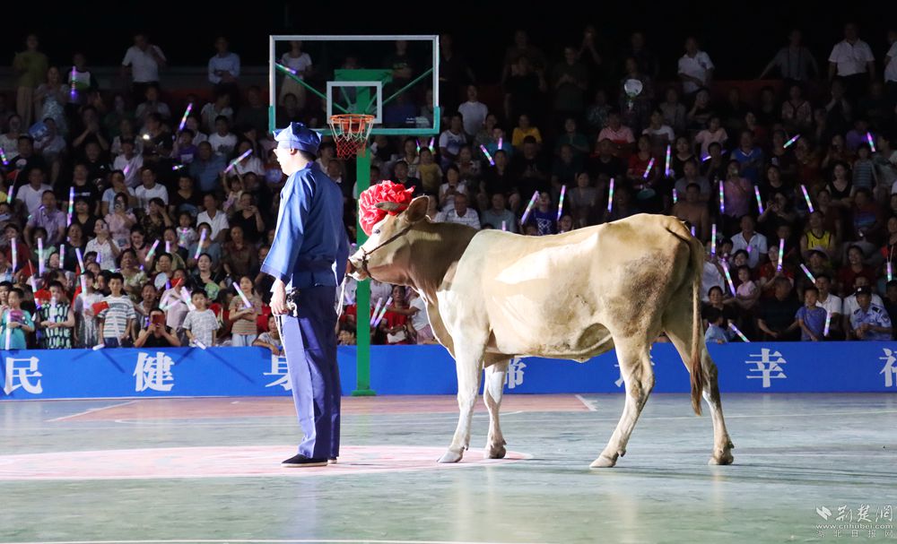 19時(shí)30分許,開(kāi)幕式開(kāi)始,聲聲震天的威風(fēng)鑼鼓、剛勁有力的武術(shù)表演、青春動(dòng)感的健身舞蹈以及活力十足的歌曲串燒,一次次引來(lái)現(xiàn)場(chǎng)的歡呼喝彩。當(dāng)工作人員牽著“冠軍牛”進(jìn)入場(chǎng)地那一刻,現(xiàn)場(chǎng)的熱烈氛圍再次被引向高潮。