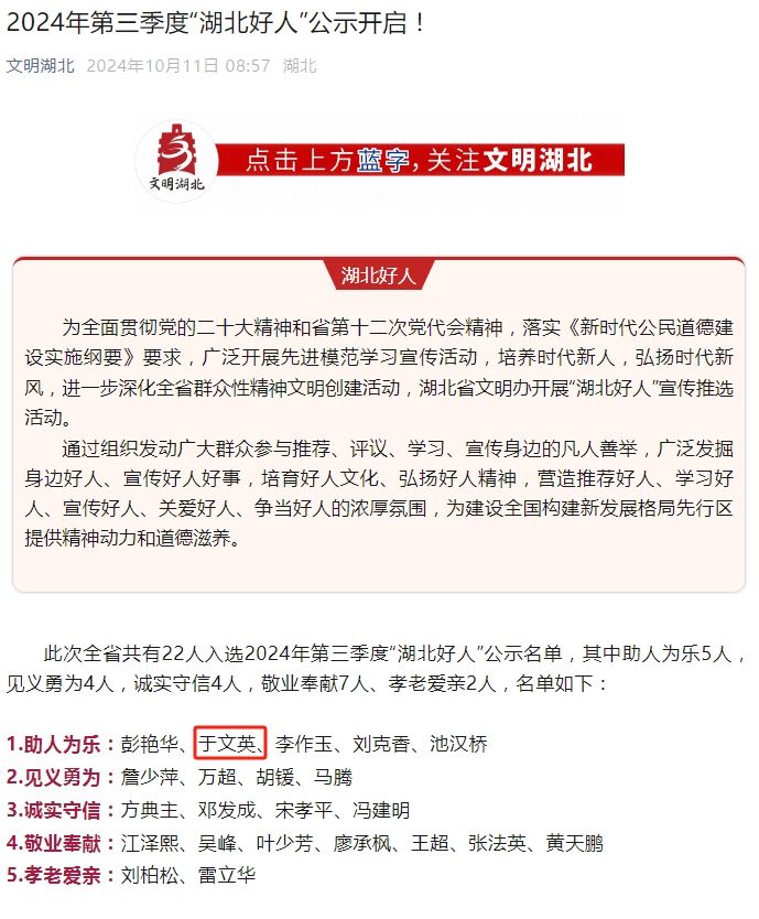 荊楚網(wǎng)(湖北日報網(wǎng))訊(記者呂鑒蕾 通訊員黃旺宣、華文莉)10月11日,2024年第三季度“湖北好人”公示開啟,全省共有22人入選公示名單。其中,“鑰匙姑娘”于文英榜上有名。